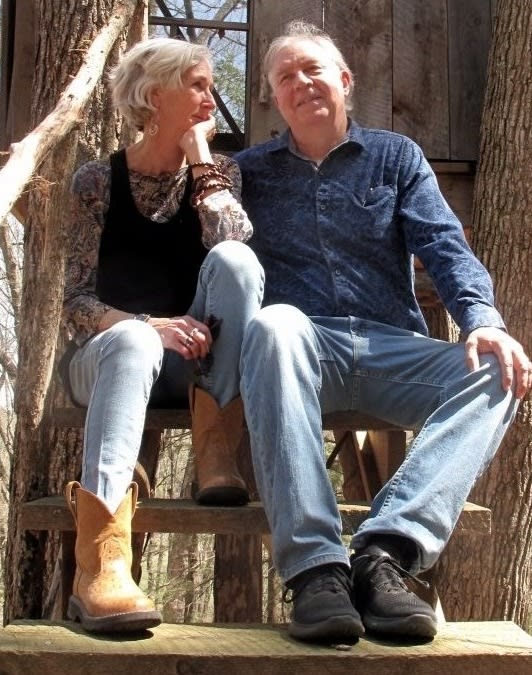 [Chard with his muse, wife Liz, on steps of a treehouse he built himself]